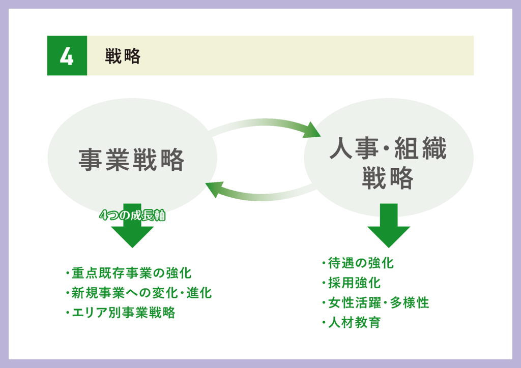 今後の戦略としては、事業戦略と人事・組織戦略に大別されます。そして事業戦略には4つの成長軸というものを設定しております。詳細は次のページ以降でご説明いたしますが、それらの軸をもとに、既存の重点事業を強化し、また新しい領域にチャレンジしていきます。また、人口問題への対応として、エリア別に事業の戦略を立てて進めていきます。