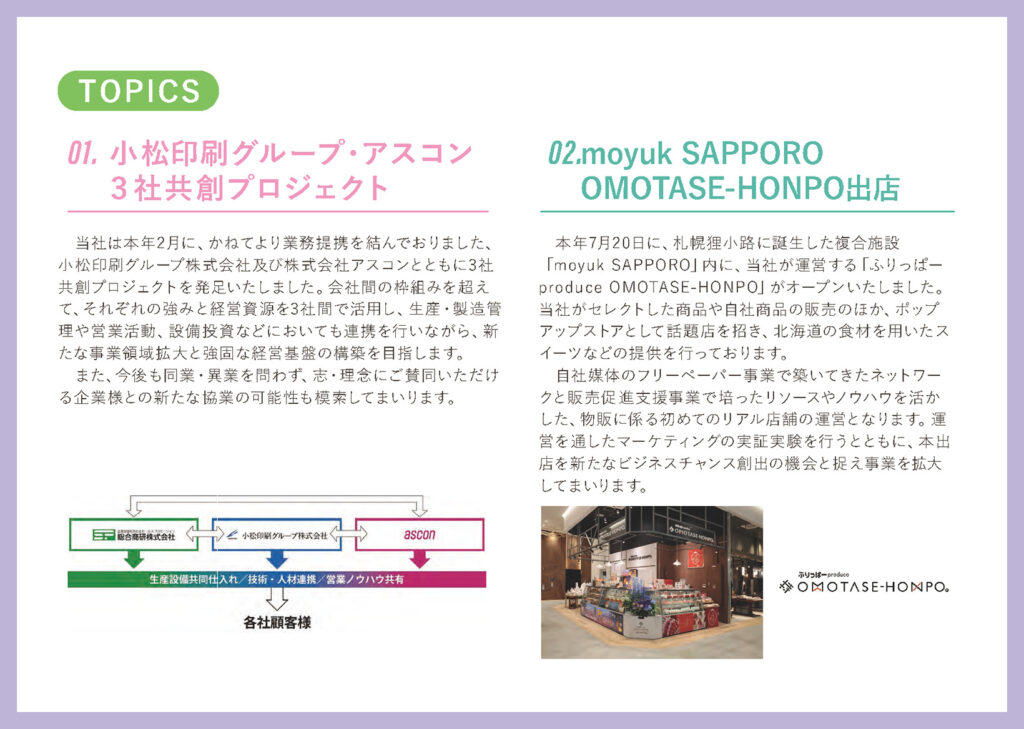 2つ目です。札幌市の中心部、狸小路と駅前通りの交差点にある、水族館が入った大型商業施設、moyuk SAPPOROの1階に、「OMOTASE-HONPO」というお店を展開しております。こちらは当社がセレクトした商品の販売のほか、「ふりっぱー」や「JP01」を通じてご縁をいただいたお客様にポップアップストアとして出店いただいております。
