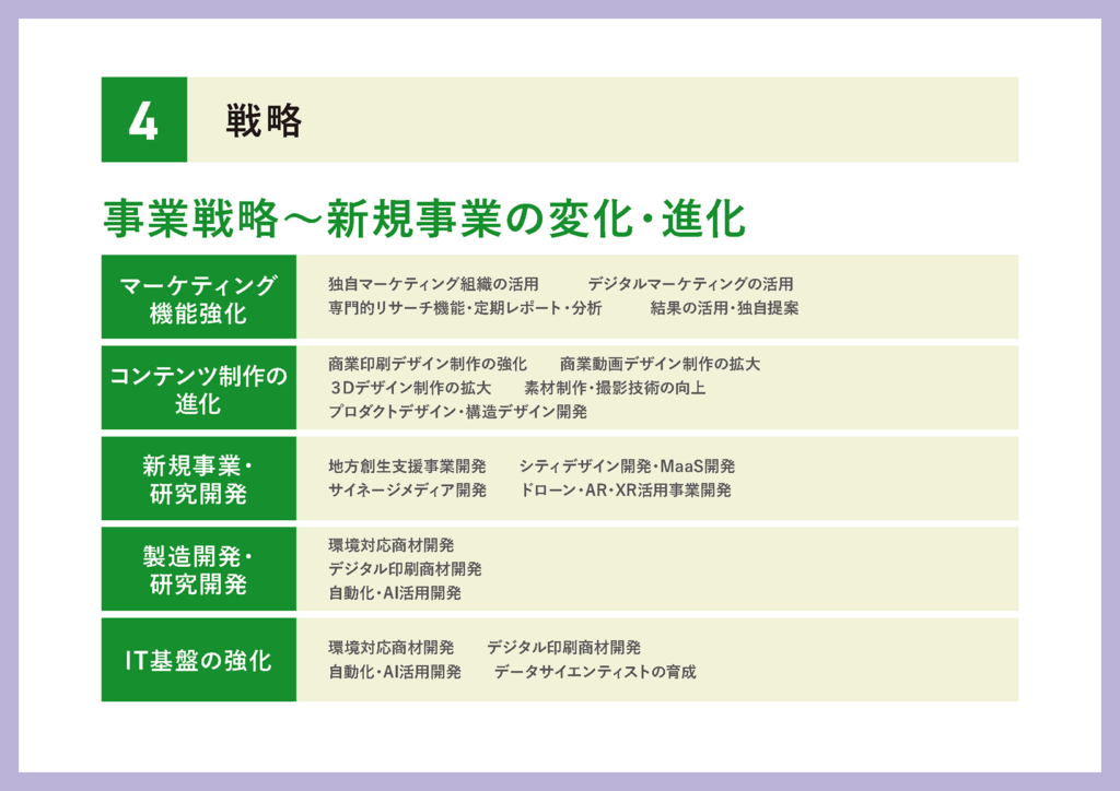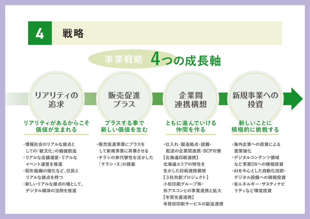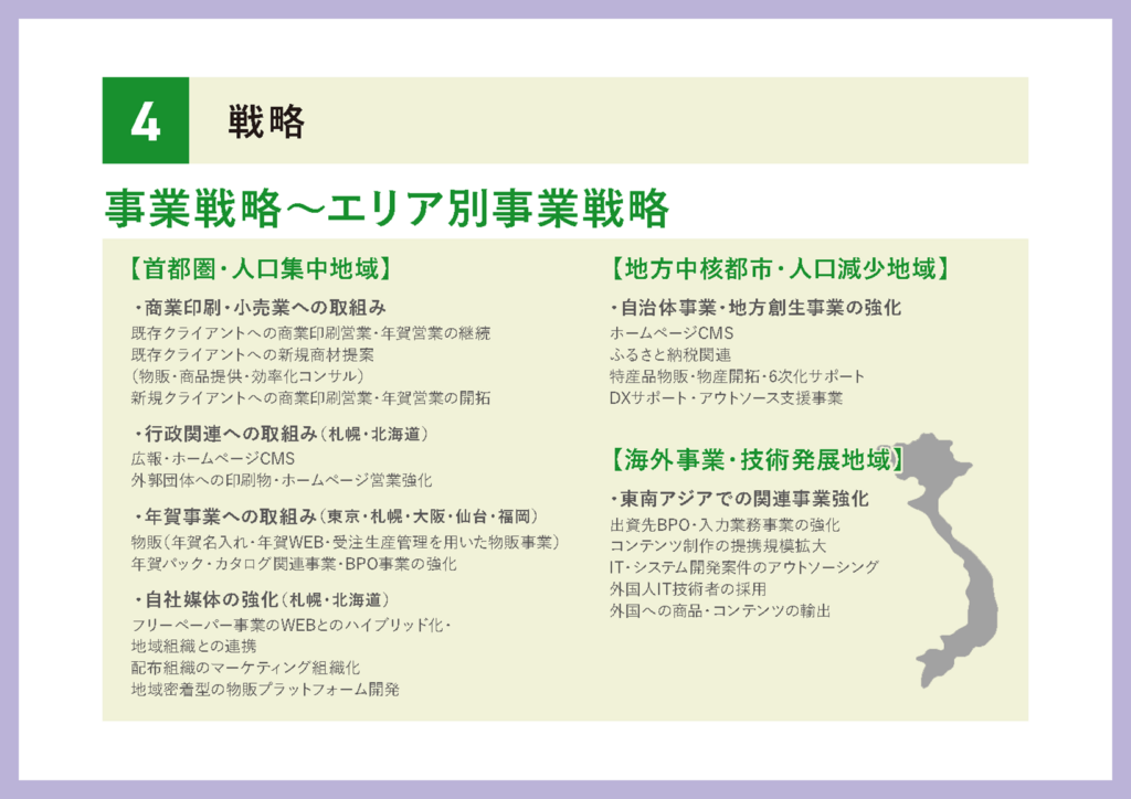 こちらはエリア別の事業戦略になります。首都圏・人口集中地域に関しては、今まで我々が行っていた商業印刷の取組みはもちろん、行政関連の受注強化として北海道や札幌市に対してより積極的にアプローチしていくほか、年賀事業についても人口集中地域に特化して展開していきたいと思っております。また、フリーペーパーなど自社媒体の強化にも取り組んでまいります。