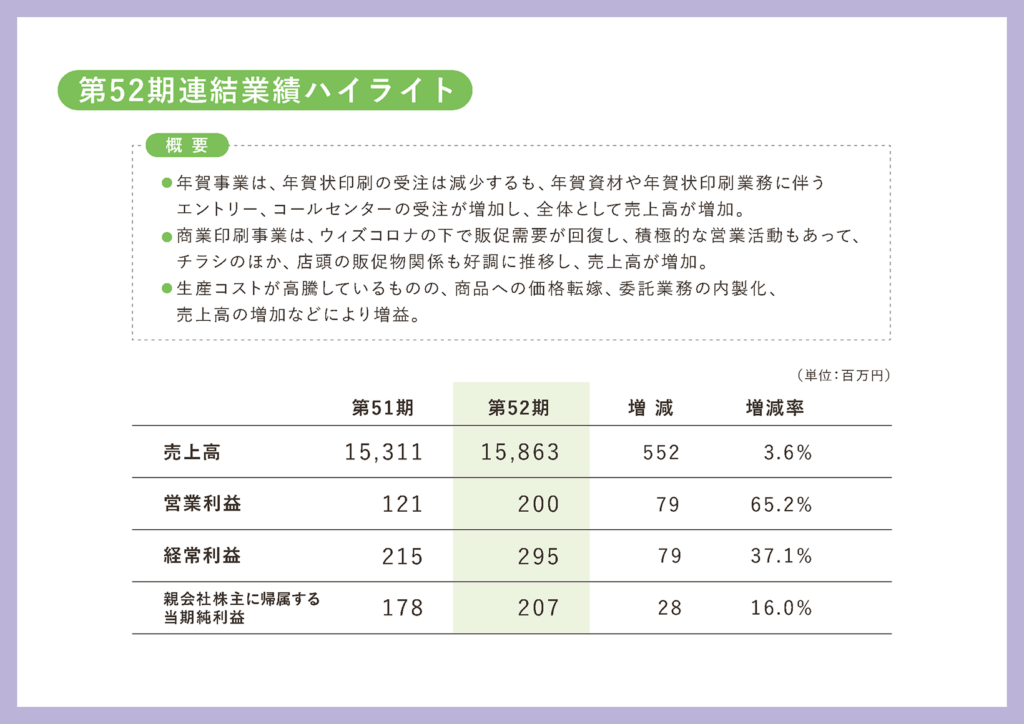 商業印刷の方も、コロナ前の状況には戻っておりませんが、ウィズコロナというところで回復基調にあり、我々の主力のクライアント様でありますスーパーなどの販促活動が活発になっておりますので、そういった部分で売上が堅調に推移したというところです。営業活動なども積極的に行っていまして、新しいクライアント様の獲得というところもプラスの要素になっております。生産コストが高騰している状況ではありますが、価格転嫁をさせていただいたり、委託業務の内製化を進めたりしたことでこのような結果になっております。