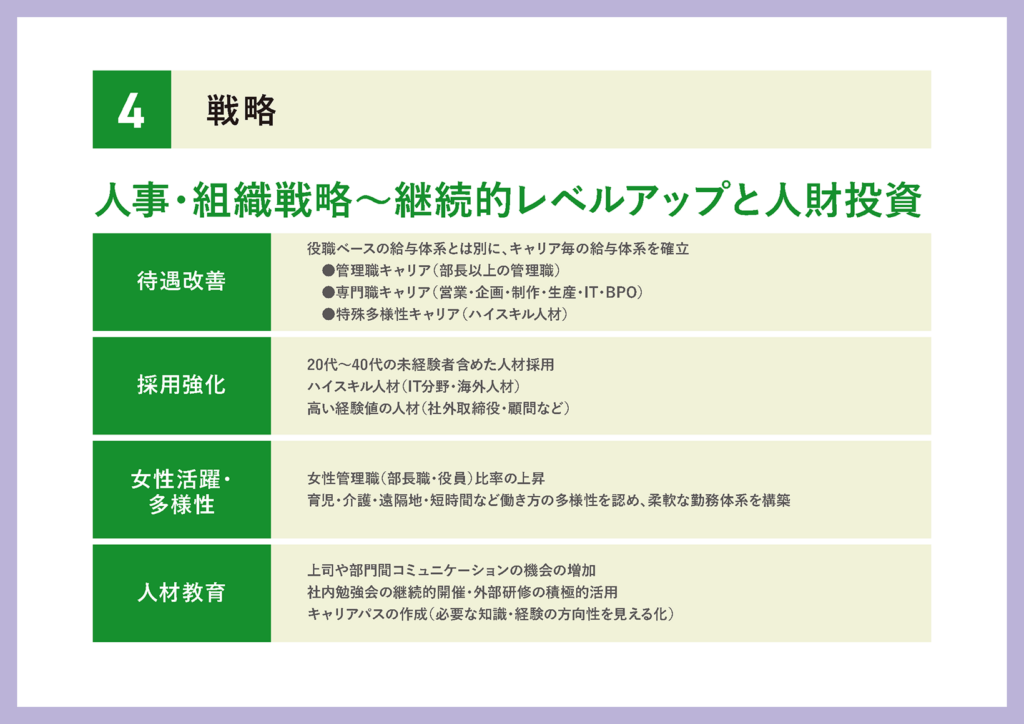 最後に、人事・組織戦略というところで、社員が継続的にレベルアップを図れる組織を目指します。役職ベースの給与体系とは別にキャリアごとの給与体系をつくり、社員が自分の将来を描きやすい環境にしていきたいと思っております。また、特殊なキャリアを持つ人材や、より高い経験値を持った方、さらには海外人材を含めたハイスキル人材の採用も積極的に行っていこうと考えております。あとは、女性活躍・多様性推進の一環として、自分の生活やライフスタイルに合わせた仕事をするための環境整備を進めてまいります。