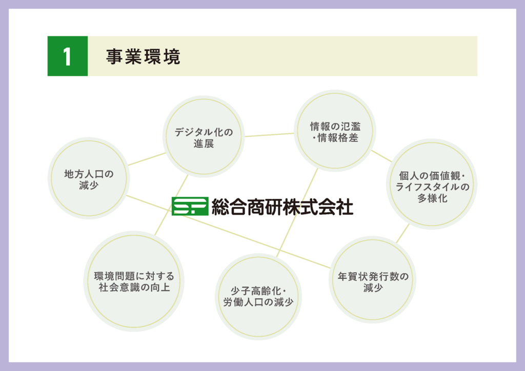 また、当社の主力事業である年賀状に関しては、発行枚数の減少がずっと続いている状況です。そして、最も大きな課題として、人口減少の問題があります。今後の15年を考えると、この人口減少が経済や社会に与える影響はかなり大きいのではないかと思っております。地方の都市においてはさらに高齢化が進み、都市部への人口集中が進行した結果、都市部と地方の格差も広がると考えられます。また、環境問題に対する社会的関心の高まりというのも非常に大きくあります。