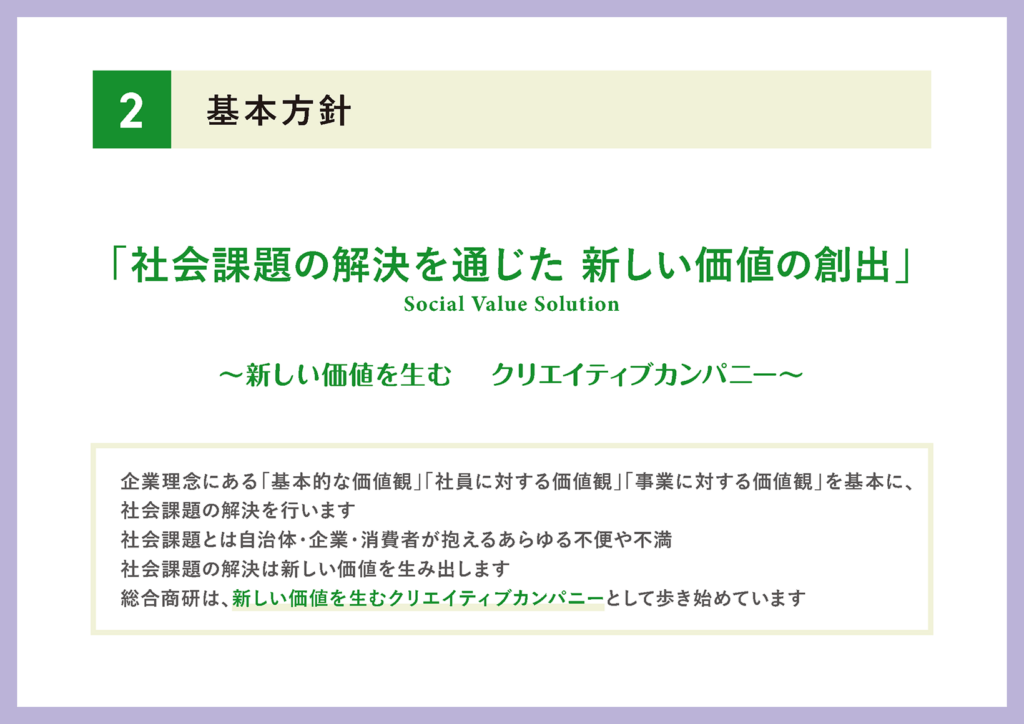 このような事業環境の中での当社の方針としては、まず当社の企業理念、ここは変わりません。基本的な価値観、社員に対する価値観、事業に対する価値観。この3つを改めて大事にしながら、社会課題の課題解決を通じて新しい価値の創出をするというところが、当社が今後15年で取り組んでいくところになります。