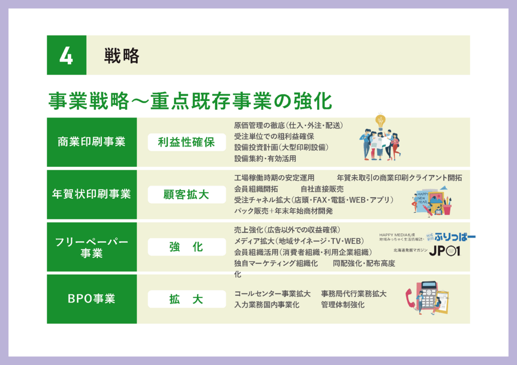 続いて、事業戦略としまして、重点既存事業を4つ挙げております。商業印刷事業、年賀状事業、フリーペーパー事業、そしてBPO事業になります。商業印刷事業、年賀状事業は当社の主力の事業となっております。フリーペーパー事業については、おそらく札幌では「総合商研」という社名より「ふりっぱー」の方が知名度があるのでは、というほどの媒体を持っておりますので、今後は、広告収入だけではなく、より広範な分野で活用できるような事業に成長させていくというのが重点的な施策となります。