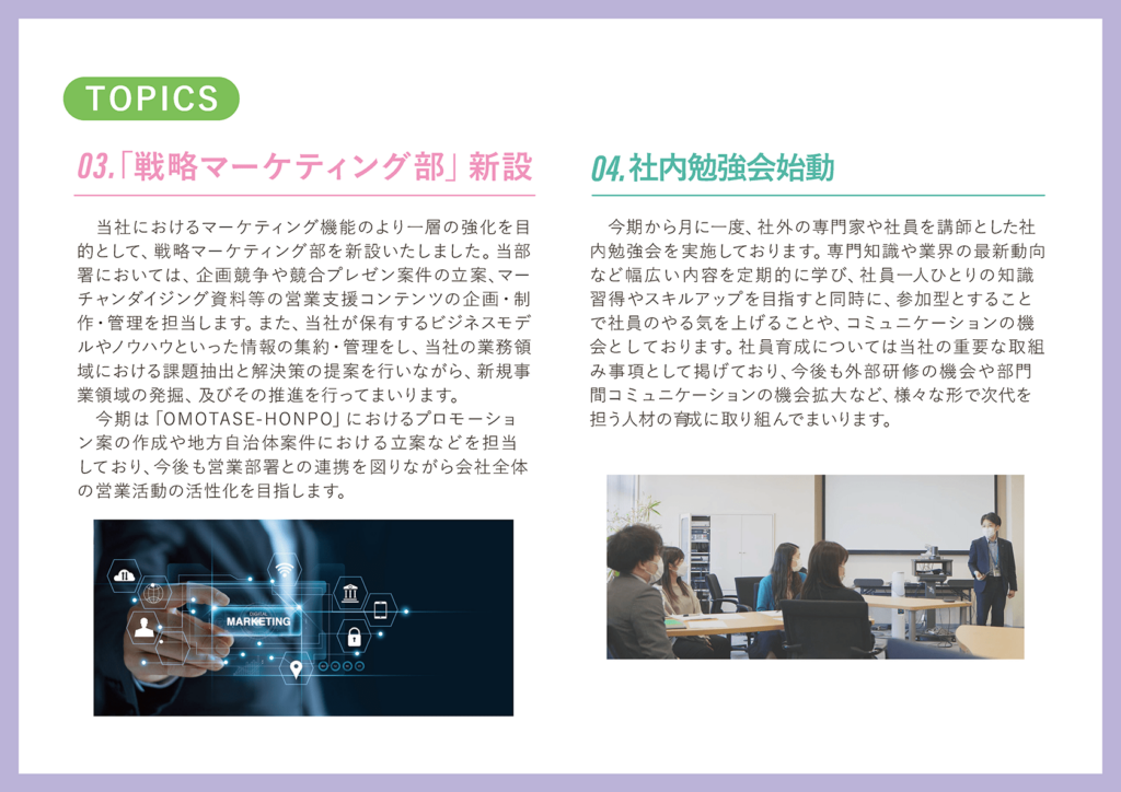 3点目として、新しく戦略マーケティング部という部署を設立いたしました。これまで行っていたマーケティングの領域からさらに踏み込み、より戦略的に行う部署として立ち上げております。当社は紙からwebまで多岐にわたって販促活動を行っておりますが、実際に一体どのようなものが効果的なのか、また、実際の消費者がどういった視点でものを見ているのかといった情報の収集や分析を行いながら、マーケティングの強化といったところを進めてまいります。