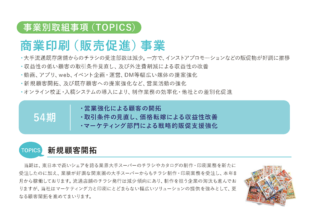 ここからはですね、事業別の取組事項を紹介してまいります。まずは商業印刷に関してですが、こちらは先ほど申しましたとおり、チラシの受注数が減っている状況にはありますが、今まで中心に行ってきたチラシによる販促以外の部分、店内のPOPや什器ですとか、そういった部分の販促物というのが、今まで営業不足だったところもありまして、このあたりに非常に力を入れております。新店出店時の販促支援などにも意欲的に取り組んでおりまして、このあたりは堅調に数字が伸びたところになります。また、収益性の低いクライアントに関しては、条件面の見直しを行ったうえで、交渉を進めております。今後も価格だけではない価値をクライアントに向けて積極的にPRしてまいります。ほかにも、動画制作ですとか、Webですとか、チラシ以外の販促物についても、次の事業の柱にすべく、非常に力を入れて取り組んでいるところでございます。