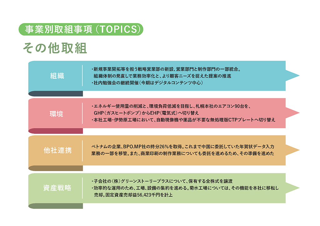 最後に、その他の取組として、組織面、環境面、他社連携、資産戦略についてご報告いたします。組織面については、先ほども申しあげた戦略マーケティング部に加えて、営業についてもより戦略的に攻めることができる部署ということで「戦略営業部」を新設しております。また、社内の業務効率化というところで、営業部門と制作部門の一部統合を行いました。今後も、より顧客のニーズをとらえた提案を行えるよう組織の再編を行ってまいります。