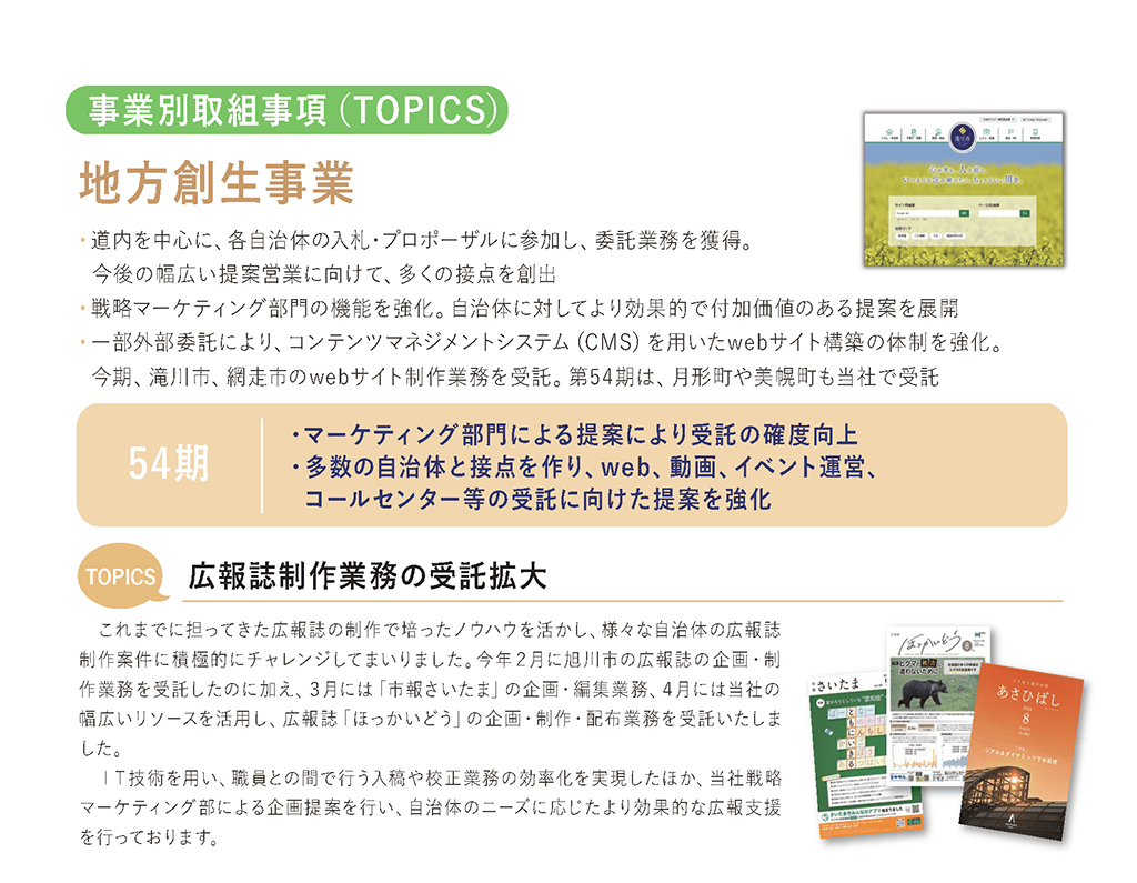 広報誌に関しては、「広報さっぽろ」の制作・印刷業務を過去数年間行ってまいりましたが、それに加えて旭川市、さいたま市の広報誌の制作業務、そして「広報紙ほっかいどう」の制作・印刷・配布業務を受託するなど、大きな自治体の広報誌の業務を受託しております。