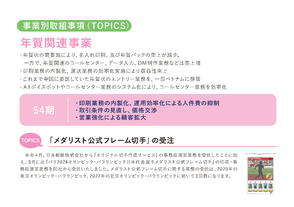 第53期のトピックスとしては、日本郵便株式会社から「メダリスト公式フレーム切手」の事務局の運営と印刷・発送業務を受注いたしました。こちらはパリオリンピック・パラリンピックのメダリストの記念切手の発行業務になります。ほかにも、好きな画像をシールタイプの切手にすることができる「オリジナル切手作成サービス」の生産が銀座郵便局で行われておりますが、その事務局の運営を、年間を通して当社がお手伝いさせていただいております。今後も、年賀状業務のノウハウを活用しながら、引き続きこういった業務の獲得を目指してまいります。