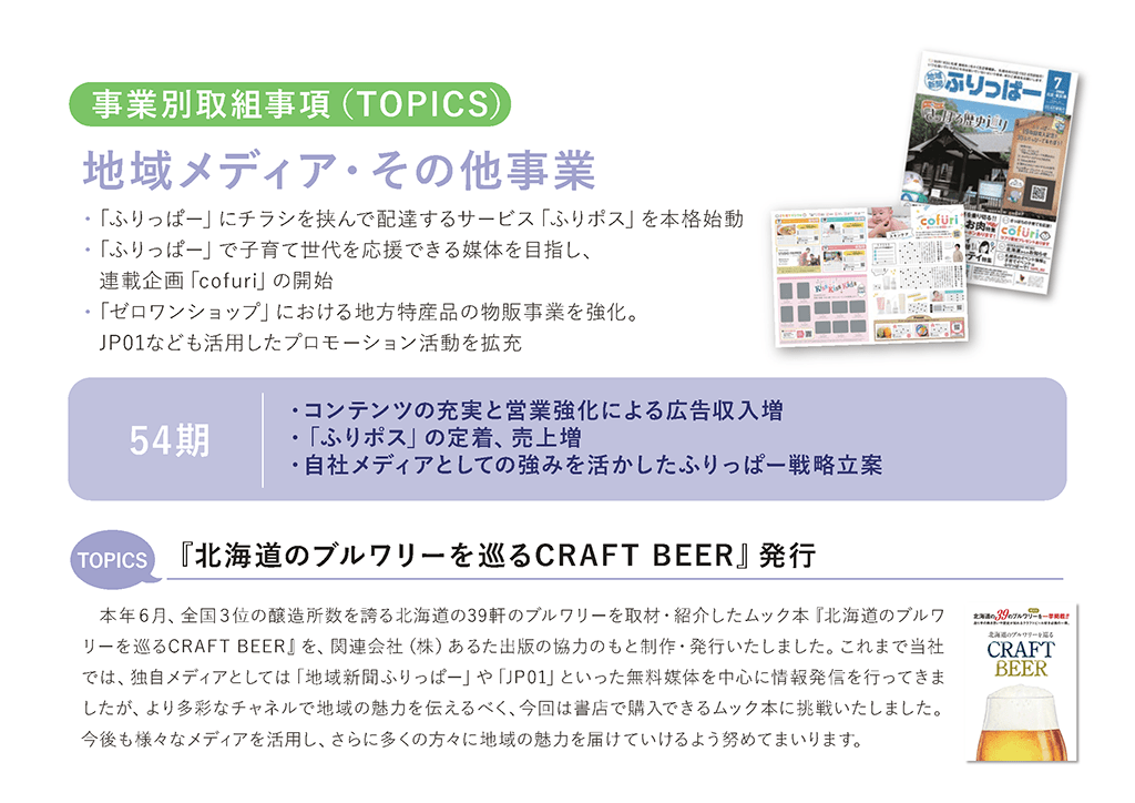 地域メディア・その他事業について紹介いたします。皆様のお手元にある「地域新聞ふりっぱー」、札幌市内で発行しているフリーペーパーになりますけれども、こちらは誌面の広告収入というところが主になりますが、それと合わせて、ふりっぱーの配布に際して、チラシを一緒に挟んでお届けするサービス、このサービスは今までもあったのですが、機能強化と、事業者の方により使いやすいものへとリニューアルを行って、新たに「ふりポス」という名前で展開を始めております。また、特定の世代をターゲットとしてしっかり捉えようということで、子育て世代応援のための「cofuri」という企画をふりっぱーでスタートし、子育て世代に対する情報発信を行っております。こちら、非常に広告の成約率が高く、また反響も大きいということで、一定の評価を得ているところでございます。