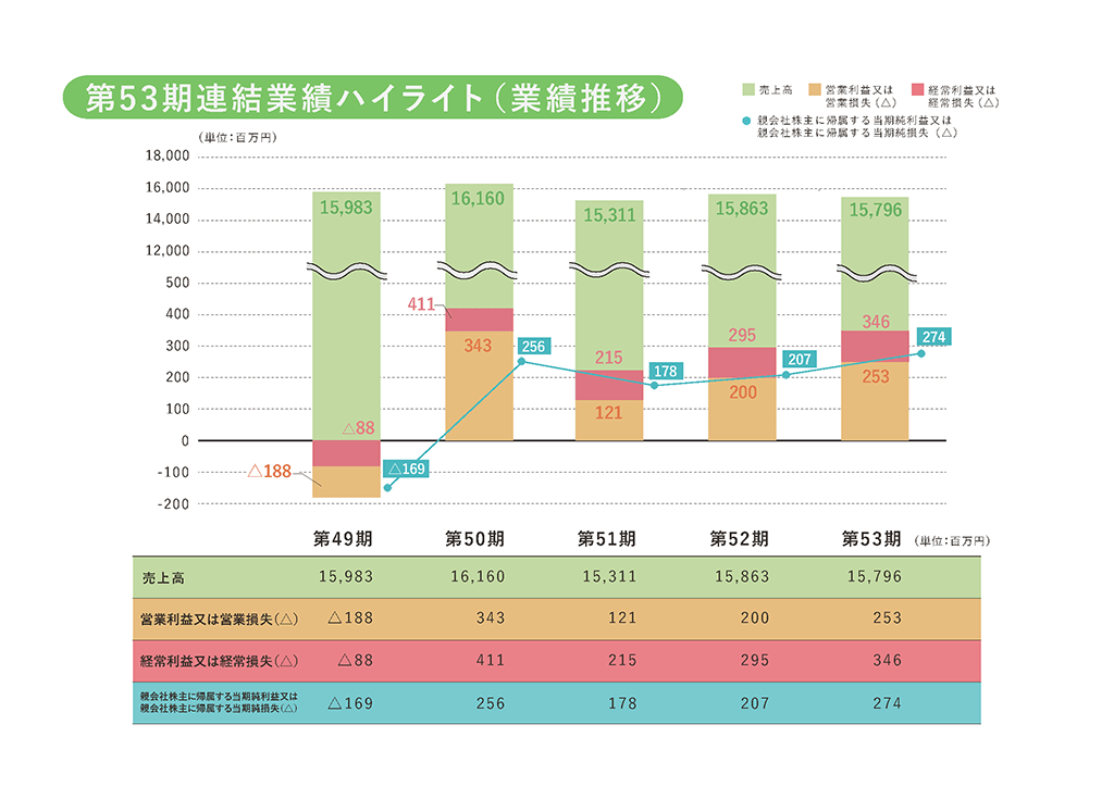 まず、第53期連結業績のハイライトになりますが、売上の方が157億9,600万円、営業利益は2億5,300万円、経常利益が3億4,600万円、親会社株主に帰属する当期純利益が2億7,400万円という形で、減収増益ということで終了しております。