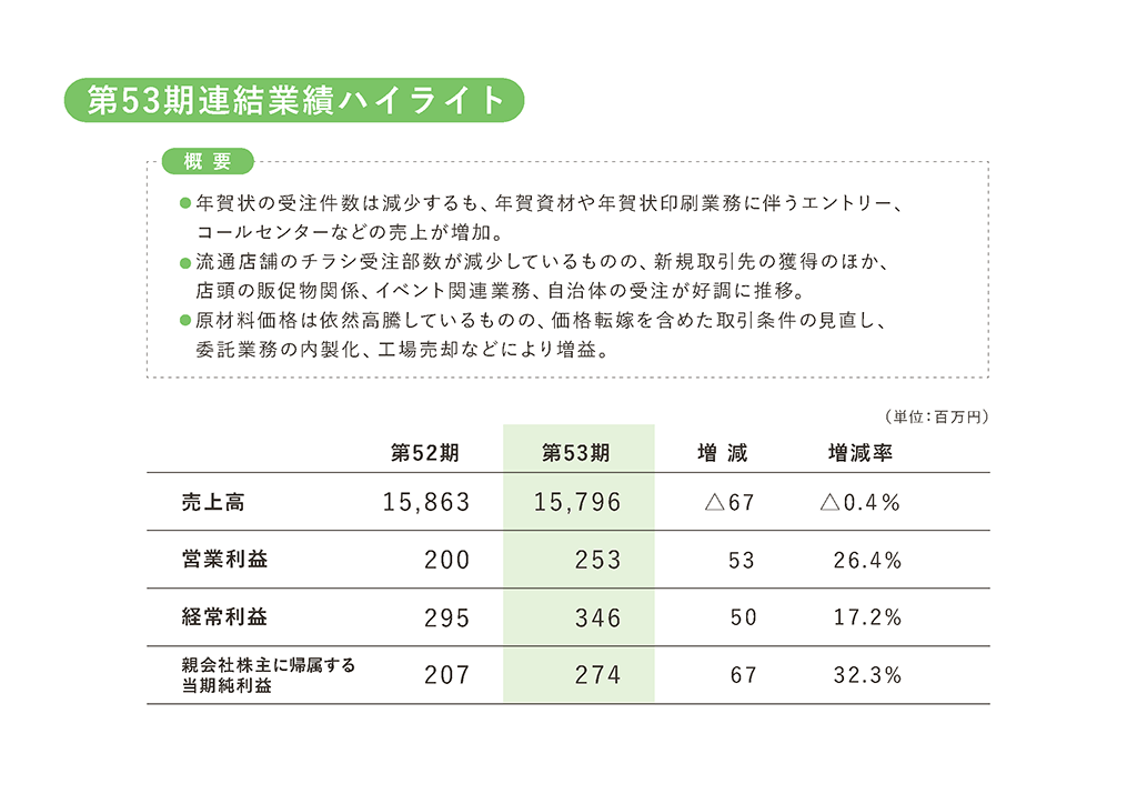 また、利益面については原材料の高騰が止まらないという状況になっておりまして、ここに関しては価格転嫁が一つポイントとなってくるかと思いますので、これをしっかりやっていく必要があると考えております。また、年賀状の受注状況については、計画段階では受注件数を抑えた計画を立てております。逆に年賀状が上向きになれば、計画よりも良い数字が見られるのではないかと考えております。このような形で第54期は進めてまいります。