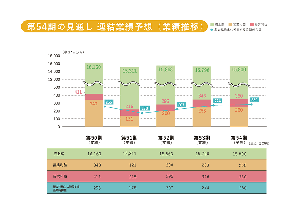 続いて、第54期の業績予想になりますが、売上の方が158億円、営業利益が2億6,000万円、経常利益が3億5,000万円、当期純利益で2億8,000万円という形で計画しております。第53期から事業の進め方等は大きく変わりませんが、徐々に年賀状・チラシが減少となっていきますので、これらの事業に頼ってばかりではなく、ほかの事業に軸足を移していきながら、自治体の動きを探っていったり、デジタル関連の事業を推進したりなどして、少しずつ売上と利益の中身を変えていくことに取り組んでいきたいと思います。