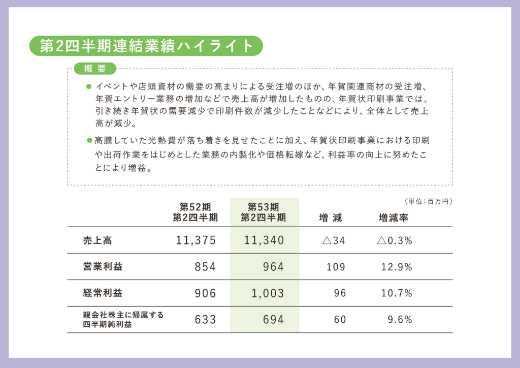 利益面については、光熱費が昨年と比べて大きく減少した点と、年賀状印刷に関してかねてから行ってきた投資によって、業務の内製化や、内部処理の効率化が可能になった点が、利益面に大きく貢献した要因になっております。
