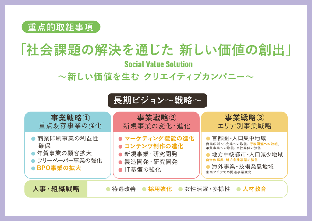 続いて、当社の重点的取組事項をご報告いたします。まず当社では現在、「社会課題の解決を通じた新しい価値の創出」という形で長期ビジョンを掲げております。その中で今、スライドの下の方に3つの枠がありまして、その中のオレンジ色で記載されている項目、こちらに関して重点的にリソースを割いて進めております。一番下は人事組織戦略になります。採用の強化と人材の育成という形で、人に対する投資というところを厚くしながら今後の活動を進めてまいります。