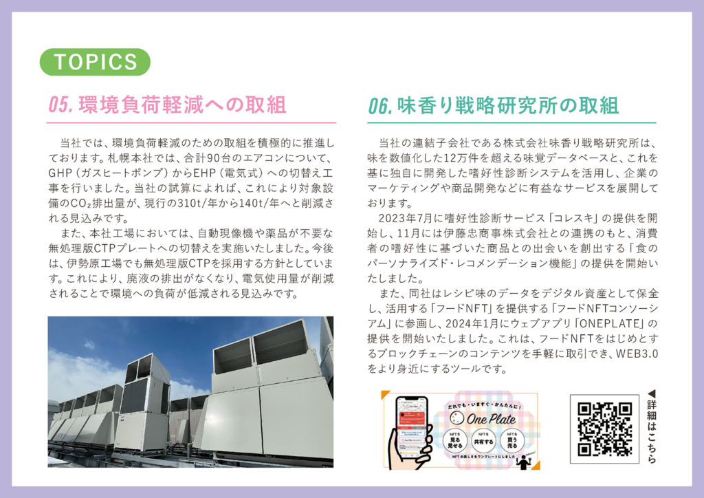 また、当社の印刷機の版材を作る機械に関しても、なるべく廃液を使わないよう無処理版のものに替えておりまして、こちらの運用により環境負荷の低減というところに貢献してまいります。