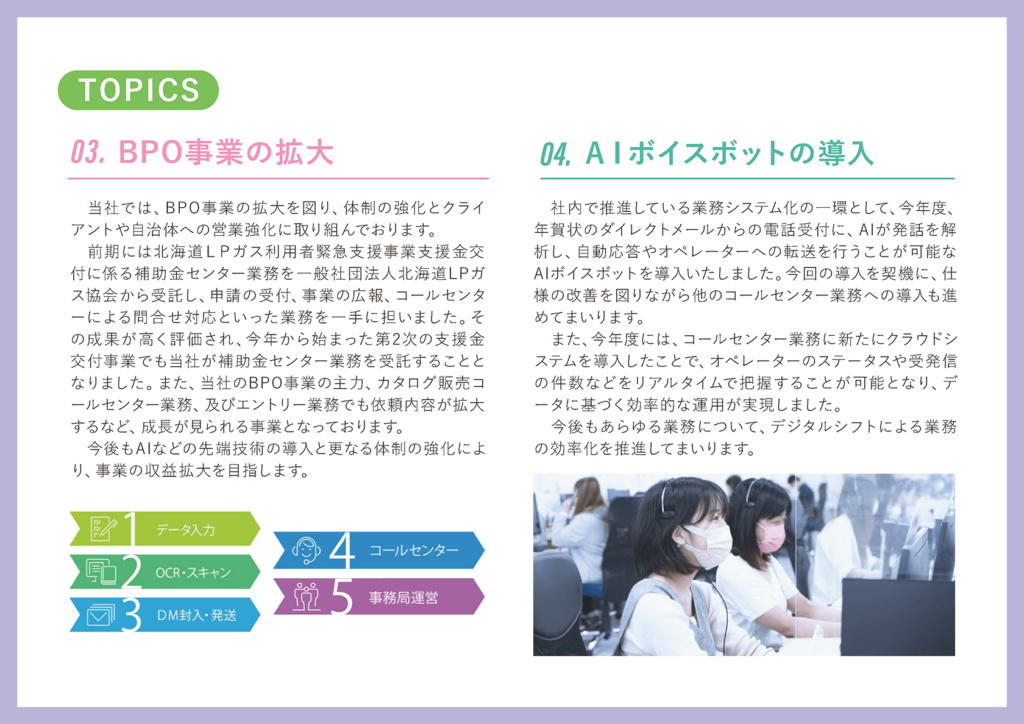 続きまして、当社BPO事業の拡大というところになりますが、もともと当社では年賀事業において、コールセンターや入力業務におけるノウハウの蓄積がありまして、これを活かしてBPO業務の拡大を推進しております。上期は、北海道LPガス協会様から、補助金の申請に係る受付業務の委託を受けております。昨年、第1回目の業務を受託し、いったん終了した際に非常に高い評価を受けており、継続して第2期目を受託している状況になります。