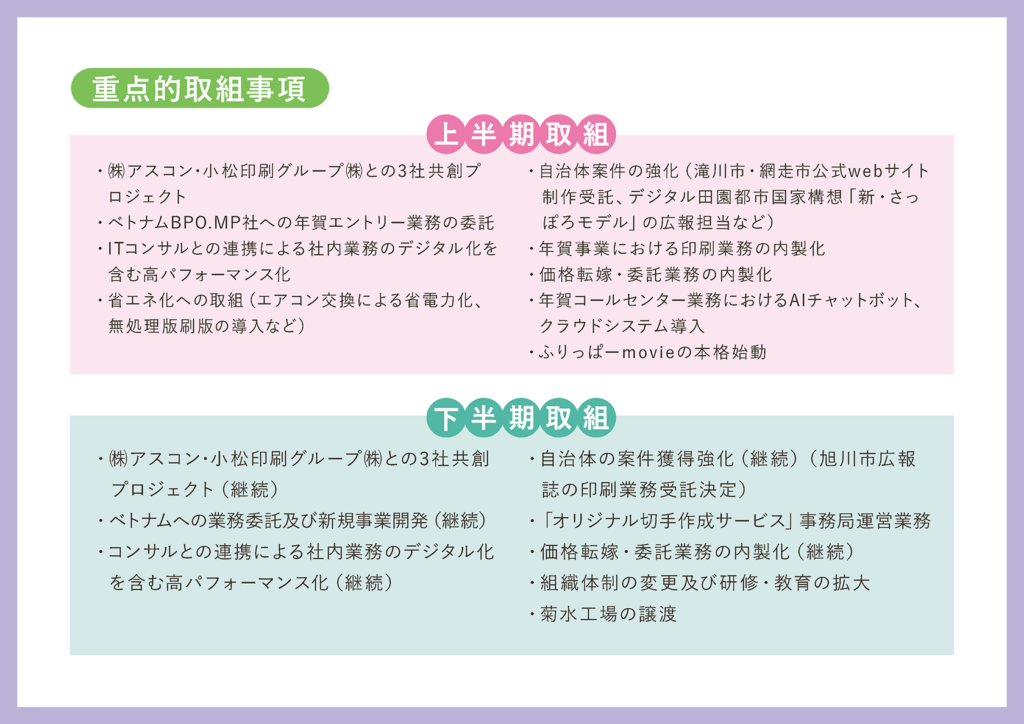 次ですが、当社の具体的な取組を上期と下期に分けて記載しております。まず、株式会社アスコン、小松印刷グループ株式会社と、当社、3社共創で様々なプロジェクトを組み、情報交換しながら、各社、クライアントに対してご提案を行うという形を継続しております。社内のネットワークだけではなかなか手に入らない情報に関しても3社間で共有しながら、またお互いに刺激を与え合いながらプロジェクトを進めております。