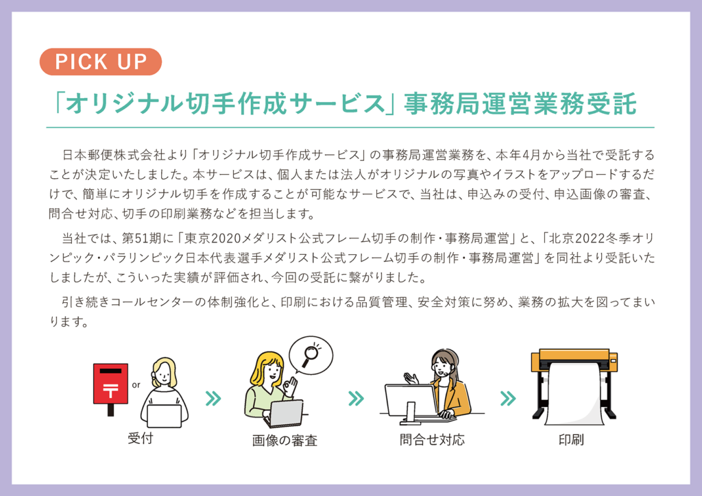 下期の大きなトピックスとして1点ピックアップしております。日本郵便株式会社におきまして、「オリジナル切手作成サービス」というサービスがありまして、こちらの事務局運営の業務を当社で受託することとなりました。これは個人の方から企業の方まで、ご自分の撮った写真ですとかイラストを、簡単にシールタイプの切手にすることができるサービスとなっております。東京の銀座郵便局の中に事務局を構えて、生産業務を含めて当社の方で一連の業務を担う形になります。第51期に東京2020のオリンピックとパラリンピックがありましたが、その際にも同社はメダリストのフレーム切手を発行しており、その業務についても当社の方で受注、実施しており、その実績もあって今回の受注につながったものと思っております。今回も、品質や情報管理について安心・安全で行い、実績を作っていきたいと考えております。