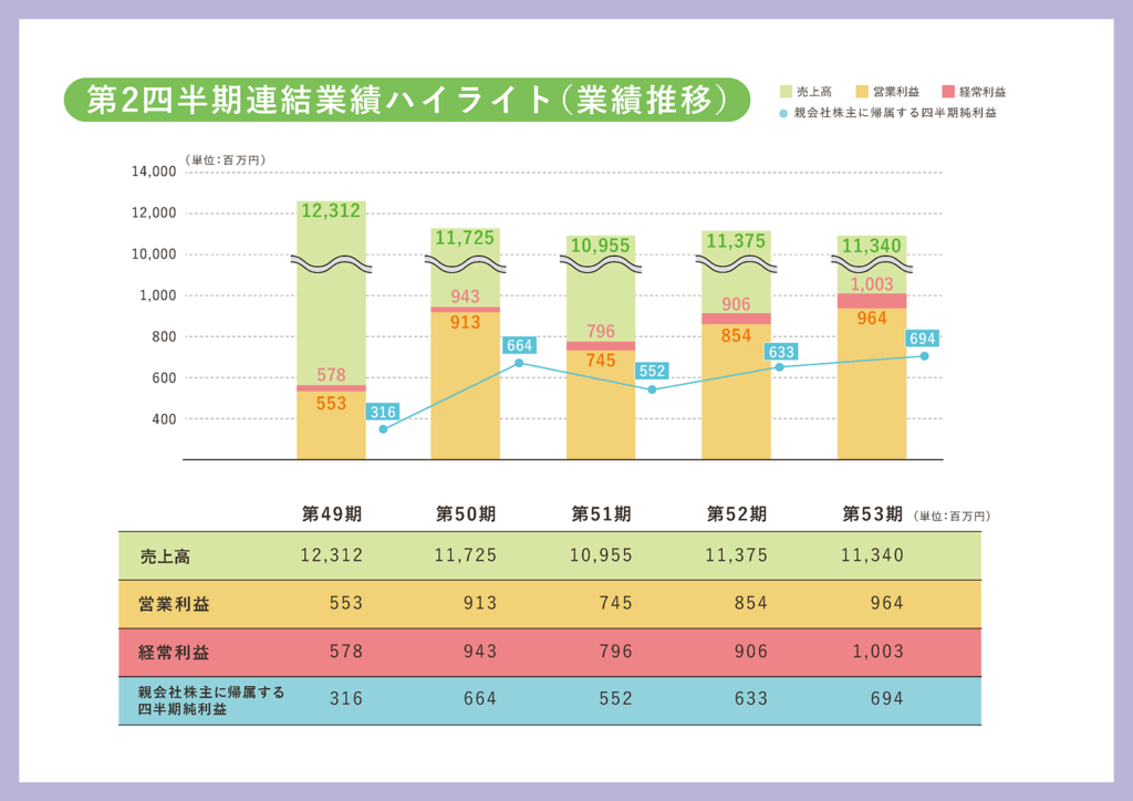 第53期第2四半期の業績の概要になりますけれども、売上の方が113億4,000万円、前期比で3,400万円ほどマイナスになっている状況になりますが、営業利益の方は9億6,400万円と1億900万円増、経常利益の方で10億300万円、9,600万円増という形で終わっております。