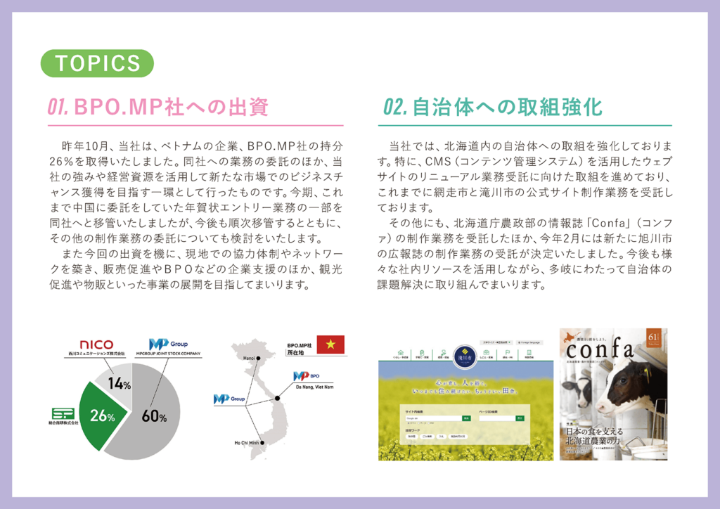 続いて、トピックスについてご報告させていただきます。前回ご報告させていただきましたが、昨年10月にBPO.MP社というベトナムで主にBPO事業を展開している会社に出資を行っております。これまで中国に委託していた文字の入力業務などをこちらに移管している形になります。あわせて制作業務、制作のオペレーション業務に関しても、現在同社への移管を進めているような状況で、外注費の圧縮といったところで大きく貢献しているところでございます。また、同社が所属しているMPグループにはIT関連を行っている会社もございますので、今後もいろいろな形で協力体制を組みつつ、そういったところの分野に関しても協議しながら進めていく予定です。
