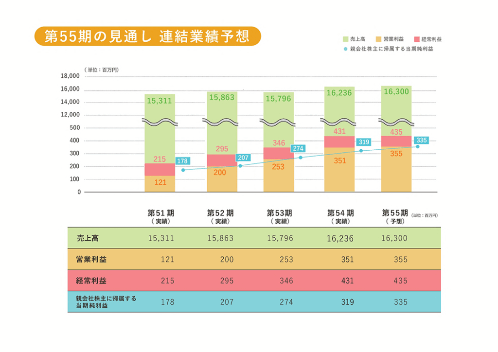 最後に第55期の見通しでございます。売上高は163億円、営業利益は3億5,500万円、経常利益は4億3,500万円を見込んでおります。年賀状事業やチラシ事業は減少傾向が続く見込みですが、新規クライアントの獲得が活発に進んでおり、減少分をカバーしていく考えでございます。運営面では省力化と効率化を推進し、収益性向上に努めてまいります。