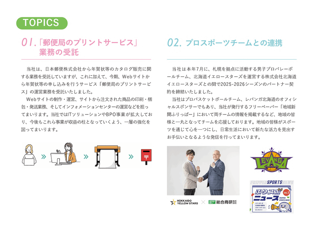 ここからは個別のトピックスでございます。かねてよりお付き合いのある日本郵便株式会社様が提供するウェブ印刷サービス「郵便局のプリントサービス」の業務を受注いたしました。年賀状印刷サービスのほか、通年で名刺や挨拶状などの印刷も行っております。また、株式会社郵便局物販サービス様から物販のBPO業務も受託しており、全国の半数のエリアのコールセンターを当社で運営しております。今後も日本郵政グループとの連携強化を図ってまいります。