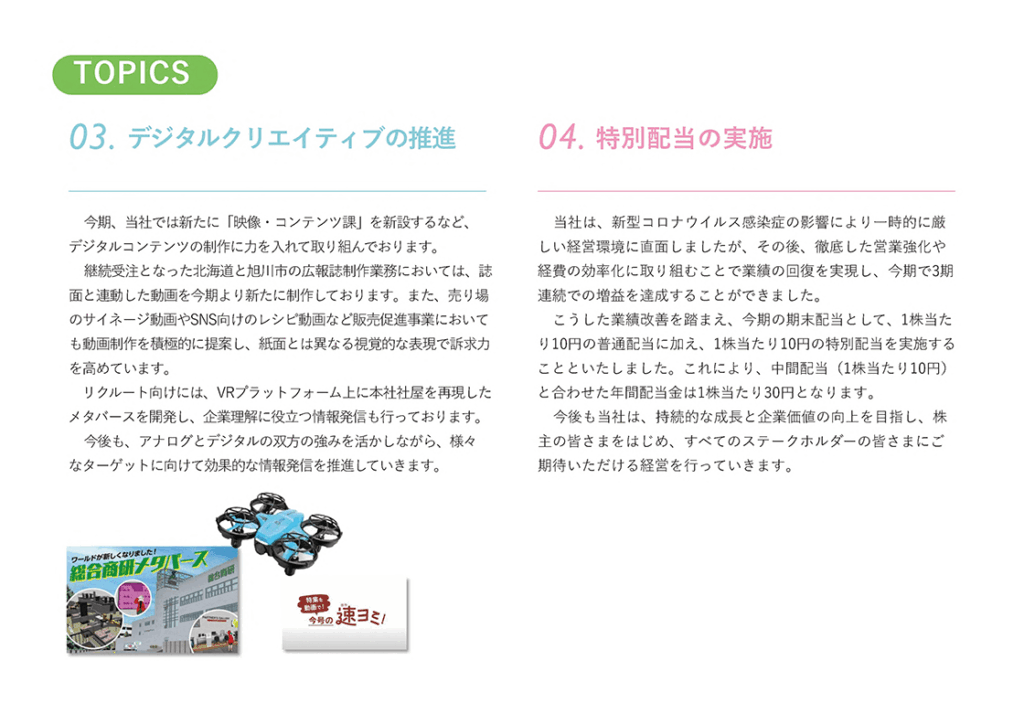 一方、販売促進事業におきましては、折込チラシの受注に関して、複数の新規クライアント獲得により、チラシ印刷の受注部数の減少を補うことができました。また、価格転嫁も適切に行えたことから増収となりました。ほかにも、まだ大きな数字にはなっておりませんが、自治体のホームページ制作やPR、イベント等に関する受注が売上に貢献したものと考えております。