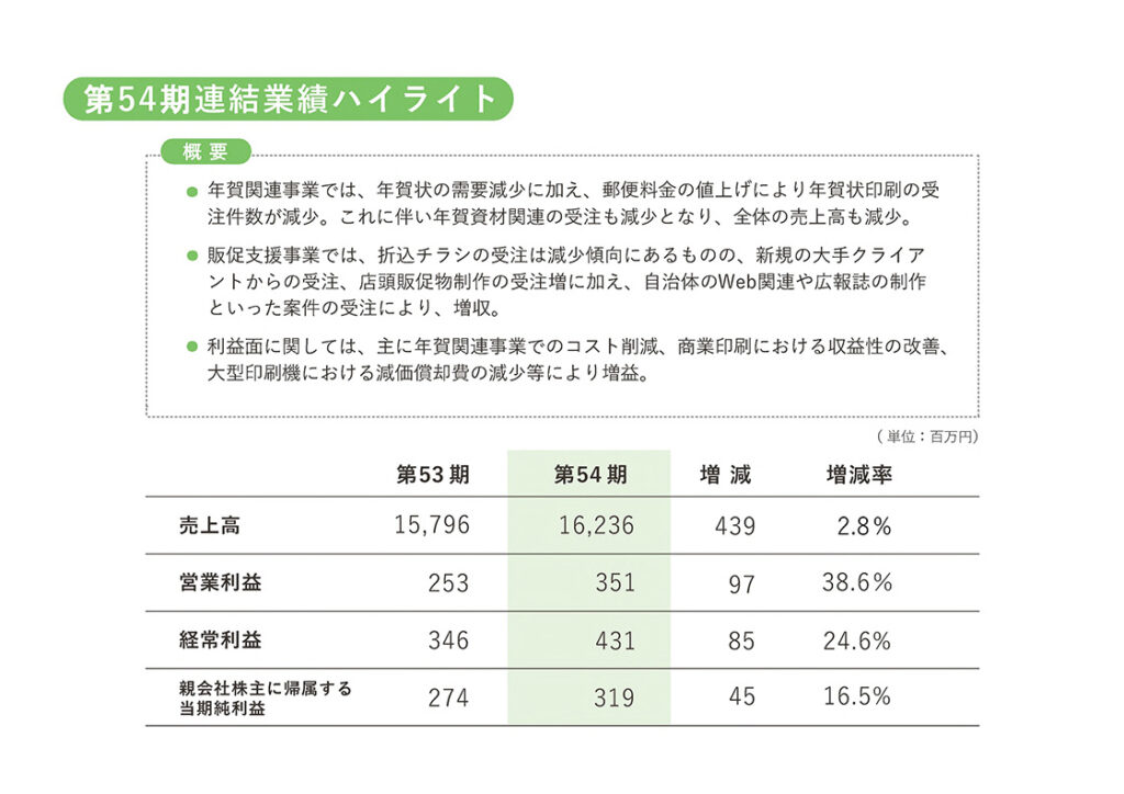 利益面では、年賀関連事業において大幅なコスト削減を実施し、生産工程の自動化の推進などが大きな成果として表れております。商業印刷事業におきましても収益性の改善が進みました。大型印刷機の減価償却が進んだことも利益増加の要因となっております。
