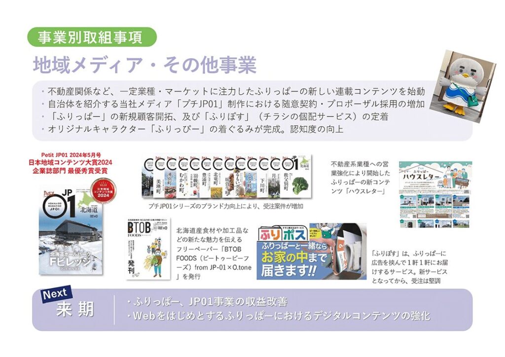 地域メディア事業は、「地域新聞ふりっぱー」を中心に展開をしております。現在、不動産や病院など業種に特化した特集を組む企画を実施しております。また、ふりっぱーに連動したチラシのポスティングサービス「ふりポス」を展開しており、札幌市内を約1万世帯ごとにエリア分けし、配布エリアを明確化することで、営業担当にとっては営業がしやすくなり、クライアントにとっても使いやすいサービスとしてご好評をいただいております。また、「ふりポス」ではチラシ印刷の受注も併せて行っております。「JP01」に関しては、本誌とは別に「プチJP01」というものを発行しており、こちらを地域の広報誌代わりにご依頼いただく自治体が増加しており、一層のブランド化を進めております。
