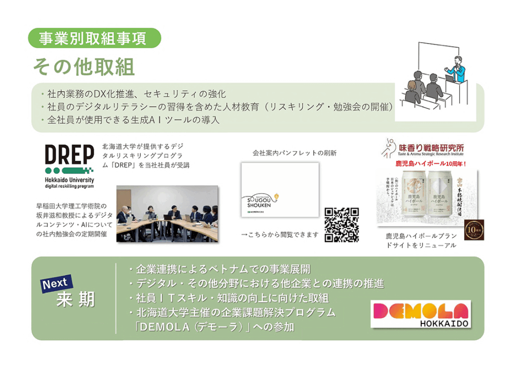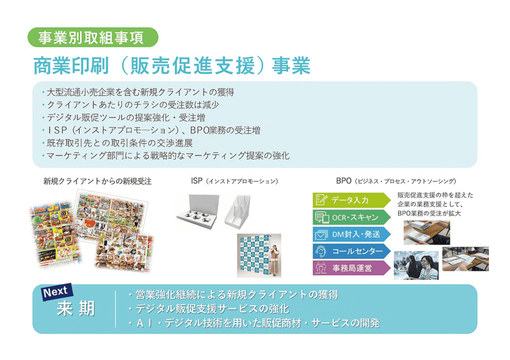 併せて、新規事業領域としてSNSを活用した販促などのデジタル領域の取組や、店内POP・ポスター等のインストアプロモーション、キャンペーンの事務局運営などのBPO業務の強化にも注力しております。印刷物中心の販促から、他領域へのシフトを図っているところでございます。