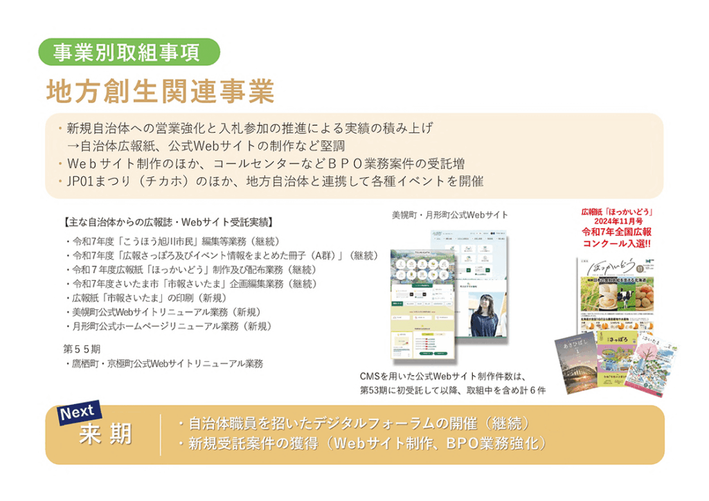 地方創生関連事業につきましては、「JP01」という当社発行のフリーマガジンを中心とした活動によって、地方自治体との強固な関係構築が進んでおります。自治体ホームページや広報誌制作業務など、広い意味での「広報」業務をご依頼いただいている状況です。自治体のホームページ制作は現在6自治体を受注しており、加えて本年中に2件の入札への参加を予定しております。北海道内50自治体の受注を目指し、引き続き取組を進めております。昨年開催した自治体フォーラムでは、自治体職員の皆様を招き、ホームページ制作や自治体DXの事例共有を行い、関係強化を図りました。今年も同様の開催を予定しております。