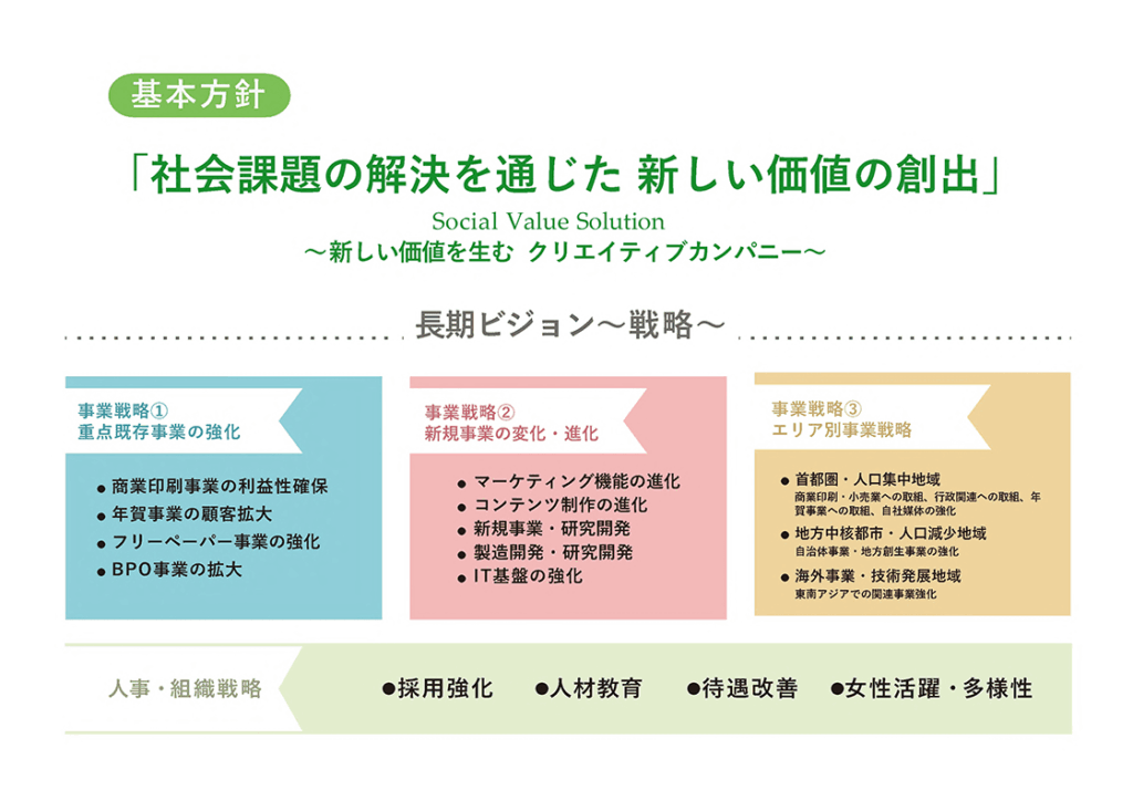 基本方針は変わらず「社会課題の解決を通じた新しい価値の創出」を掲げております。このページには「印刷」という言葉はほとんど出てきておりません。印刷を中心にやってきた会社にはなりますが、それ以外の領域の販売促進というところを強化していきながら進めたいと考えております。
