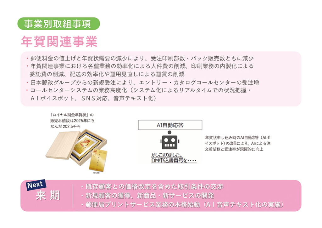 次に年賀関連事業についてです。先に申し上げました通り、郵便料金の値上げと年賀状需要の減少が大きな影響を及ぼしております。回復は容易ではないと考えておりますが、主要クライアントと協力しながら減少幅の抑制に努めるとともに、一般のお客様に年賀状文化を楽しんでいただき継続していただけるような施策にも力を入れております。加えて、内製化や人件費削減を目的とした自動化の推進も継続しております。生産工程においては自動化がかなり進んでいる一方で、年賀状のデータを制作する段階や、コールセンターなどのお客様対応の部分はまだ人手を要しており、ここに関してはAI技術の活用が期待されております。AIによる電話自動応答の導入などの取組を進めているほか、デザイン領域においても各種AIサービスの活用を検討中です。