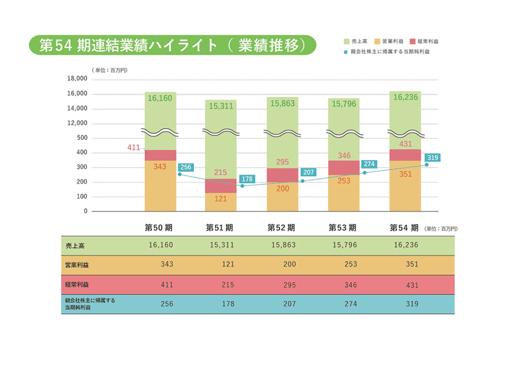 まず、第54期連結業績のハイライトですが、売上高は162億3,600万円となり、前期比で約4億3,900万円の増収となりました。利益の方は、営業利益が3億5,100万円で9,700万円の増加、経常利益が4億3,100万円で8,500万円の増となり、増収増益という形で終了しております。