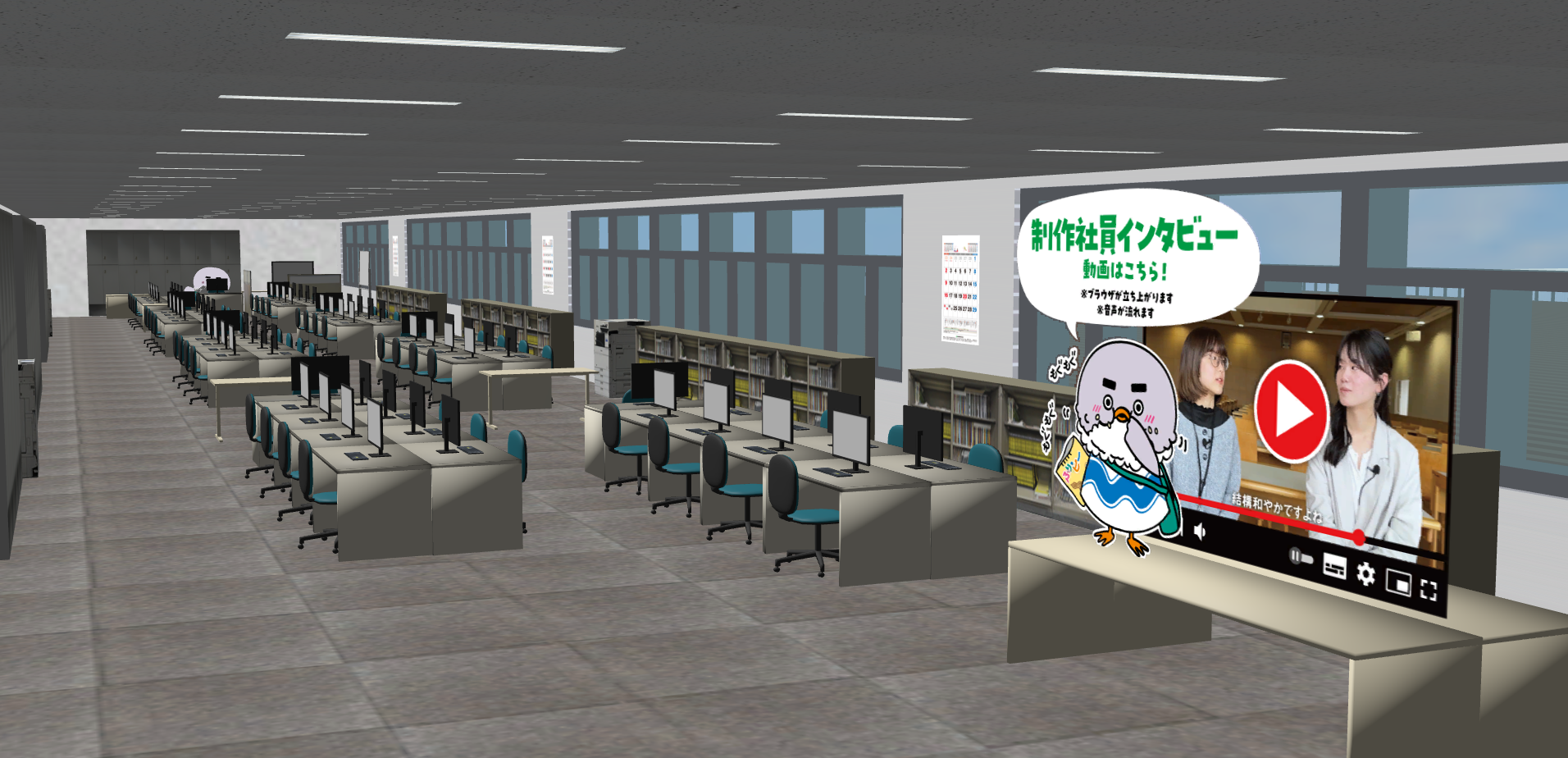 来社せずとも総合商研の雰囲気を感じ取っていただけるように制作されたこのメタバースは、総合商研の社屋を(ほぼほぼ)忠実に再現し、企業理解に役立つさまざまな特別コンテンツを用意しております。